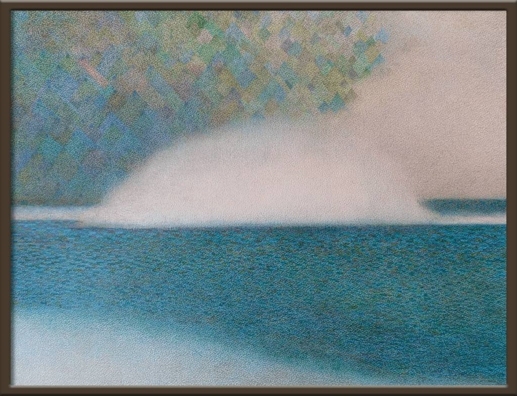 犀川の久米路橋付近の流れ。深さを感じさせる静かな水面から霧が湧き立つ景色をデフォルメした。